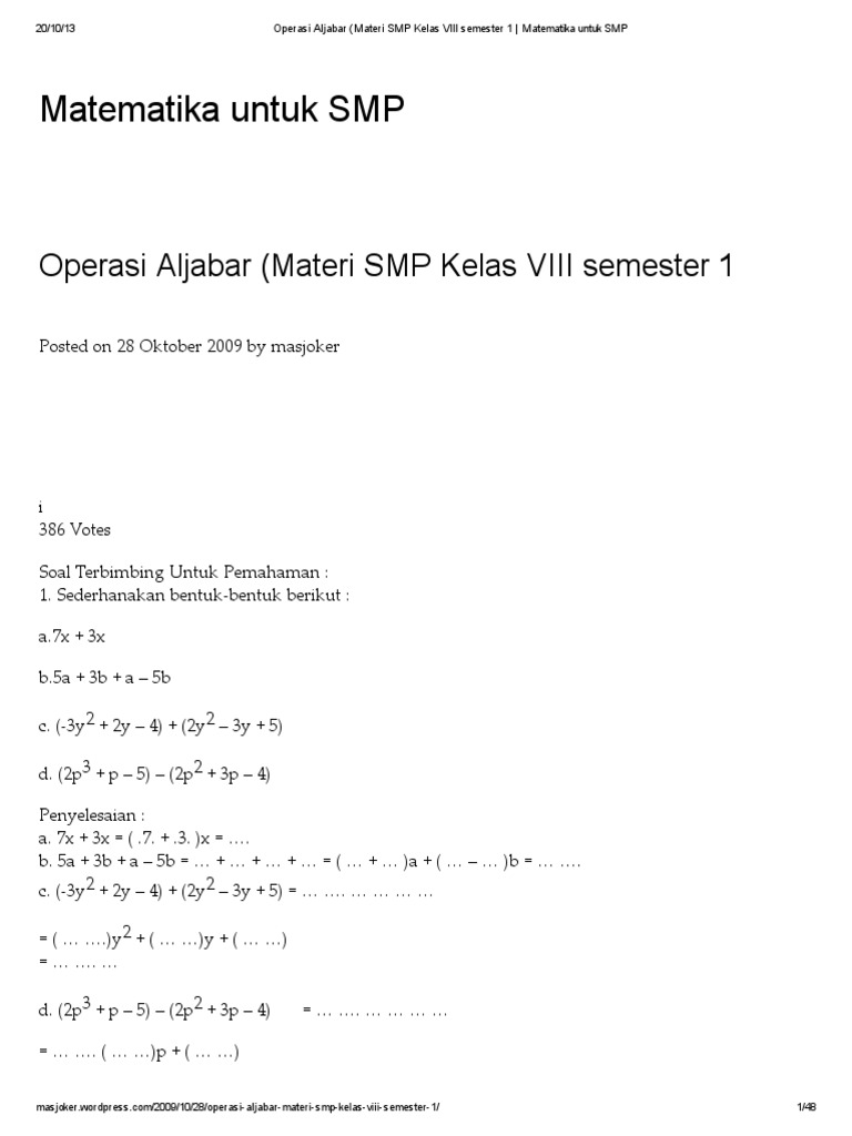 Contoh Soal Aljabar Smp Ruang Belajar Siswa Kelas 8