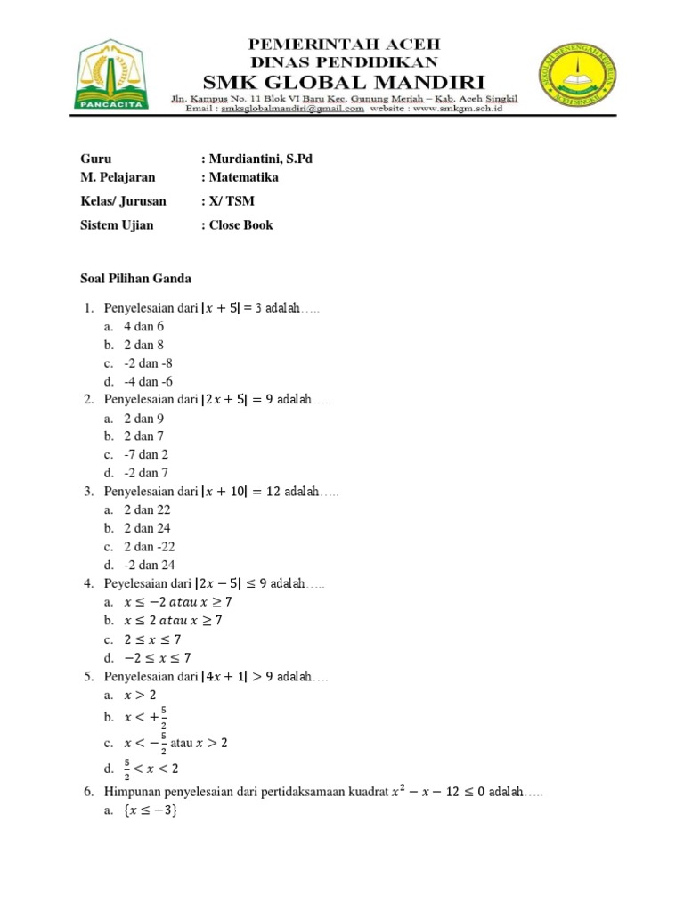 Soal Matematika Kelas X Smk Semester Ganjil Soal Uas Smk Bm Parwst