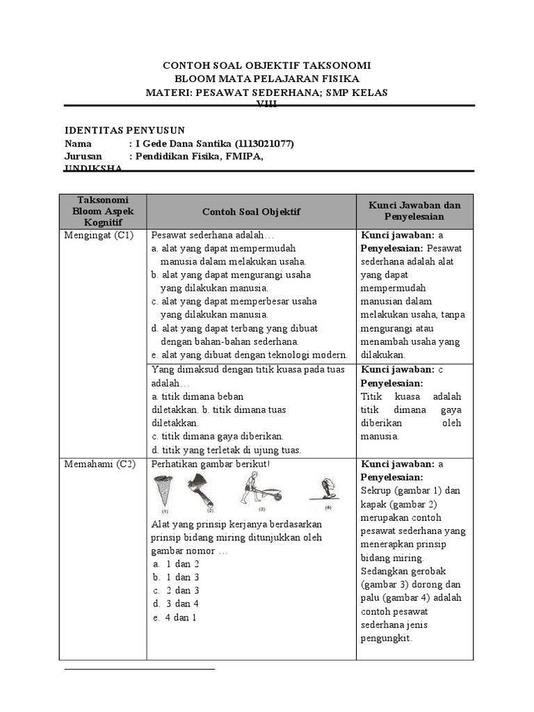 Pdf Contoh Soal Objektif Taksonomi Bloom Mata Pelajaran Fisika