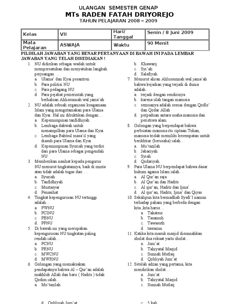 Lengkap Soal Uas Qurdits Mts Kelas 7 Semester 1 Tahun Pelajaran 2018