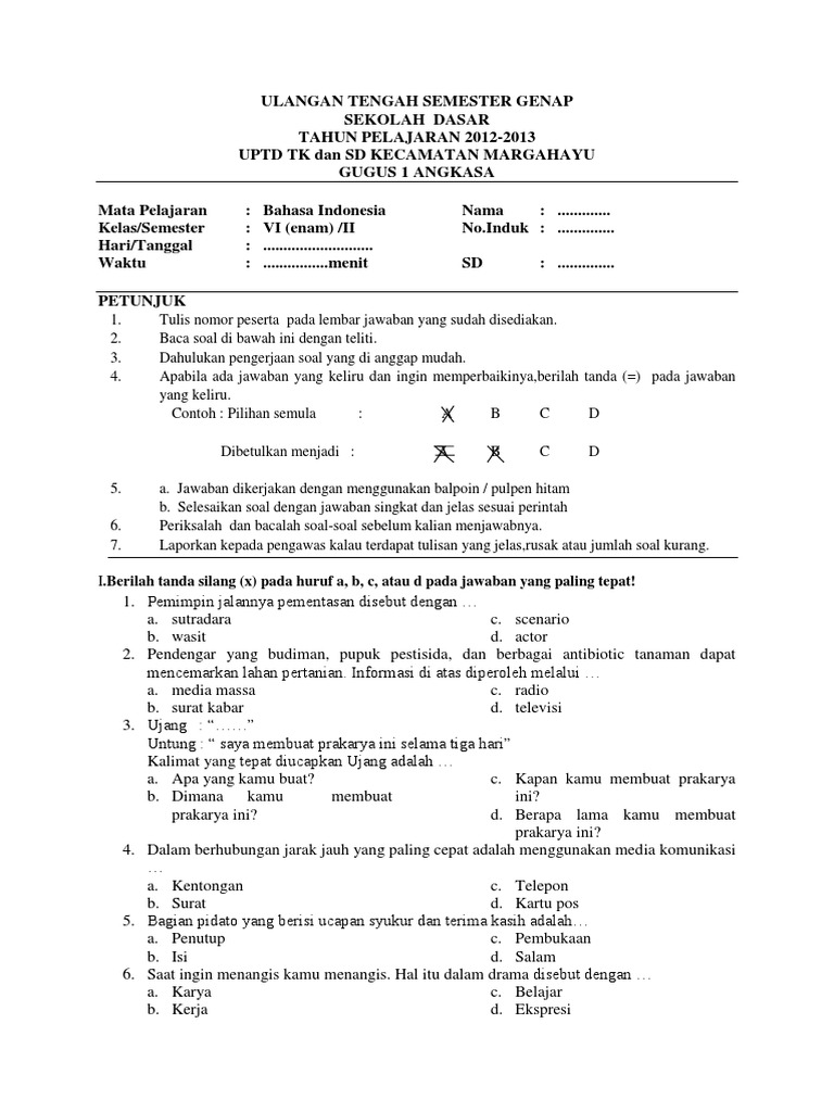 Soal Pts Uts Bahasa Indonesia Kelas 6 Semester 1 Sd Mi Tahun 2019 2020